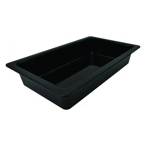 Plat noir format gastro en mélamine, bords larges sur pieds silicone, GN1/2