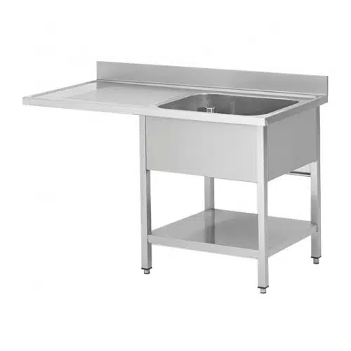 Plonge avec passage lave vaisselle sur pieds carrés, étagère pleine, en inox AISI 201, 1 bac, égouttoir a droite, L 1200 mm