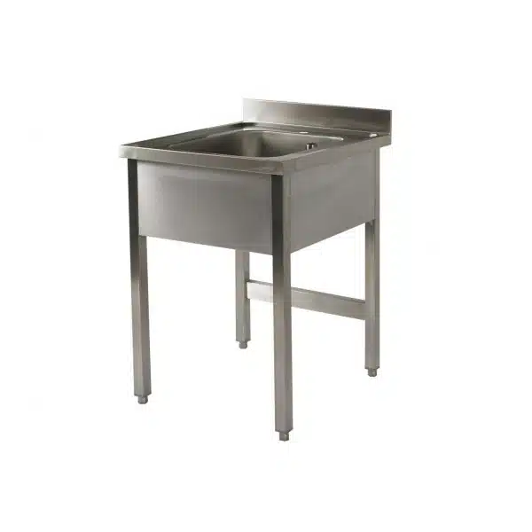 Plonge soudée sur pieds carrés sans étagère, inox ferritique, 1 bac au centre, profondeur 700 mm