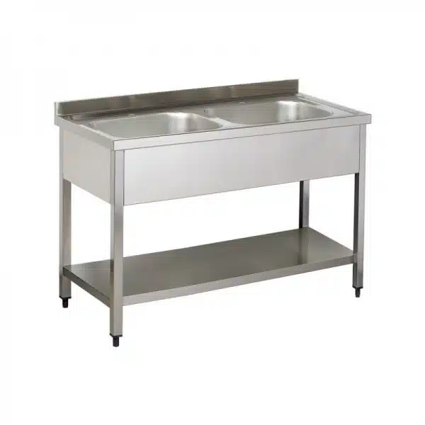 Plonge démontable adossée, en acier inoxydable, avec étagère, 2 bacs au centre, P 700 mm