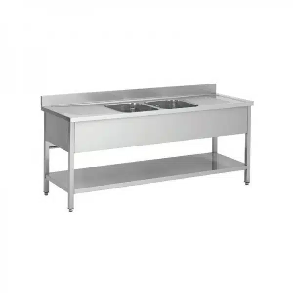 Plonge démontable adossée, en acier inoxydable, avec étagère, avec égouttoir et 2 bacs au centre, L 2000 mm