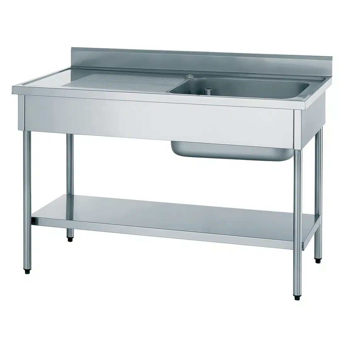 Plonge démontable avec étagère, adossée, 1 bac + égouttoir à gauche, essentielle pour assurer la propreté de vos vaisselles et de vos ustensiles de cuisine.