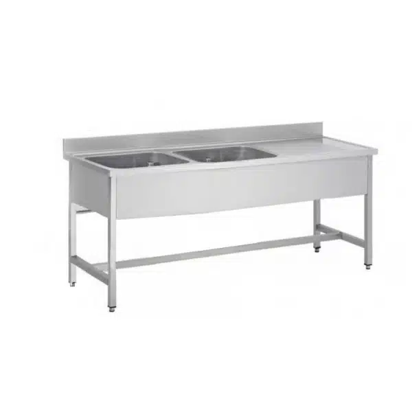 Plonge soudée sur pieds carrés avec étagère, inox ferritique, 2 bacs, longueur 1800 mm