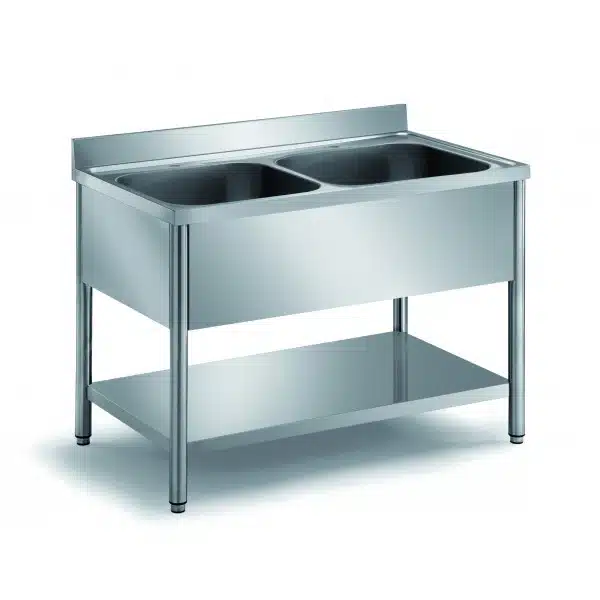 Plonge démontable sur pieds ronds avec étagère inox AISI 304 2 bacs au centre longueur 1200 mm