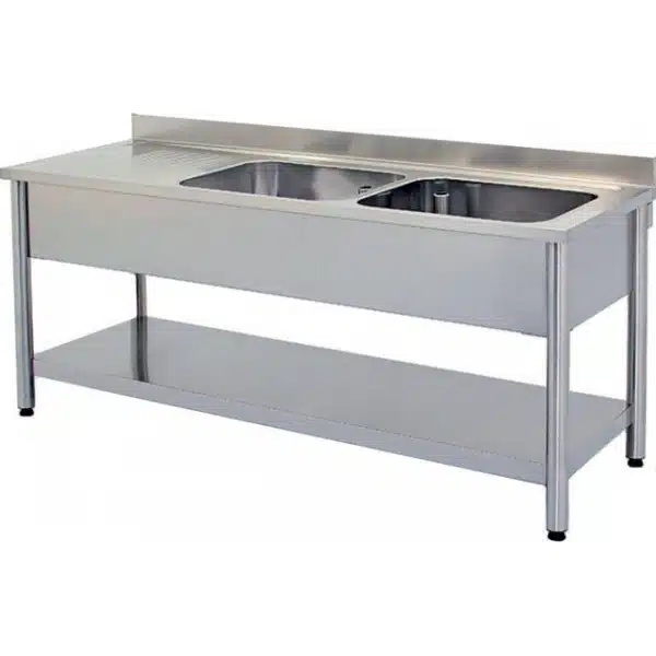 Plonge démontable sur pieds ronds avec étagère inox ferritique 2 bacs longueur 1600 mm