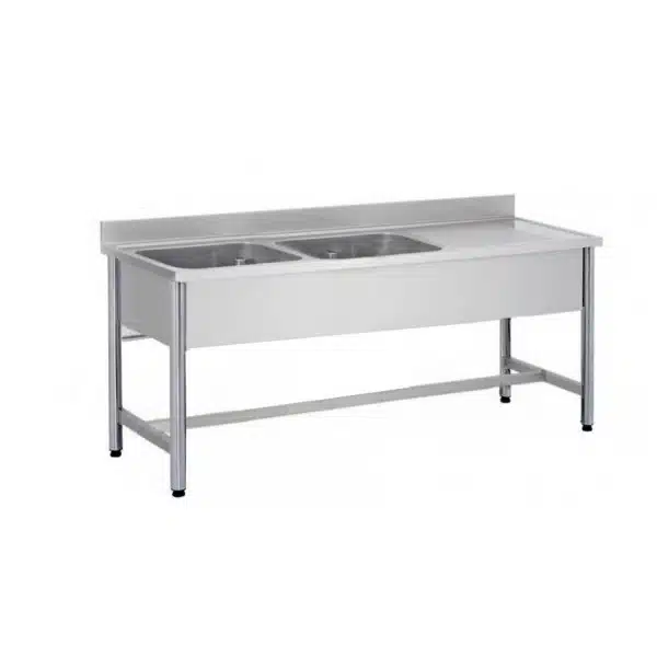 Plonge soudée sur pieds carrés sans étagère, inox ferritique, 2 bacs, longueur 1800 mm
