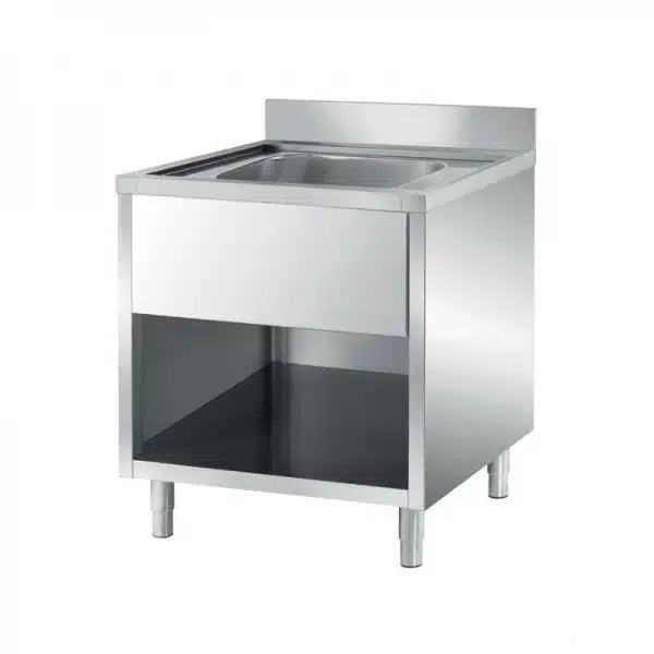 Plonge ouverte pré-percée sans porte, inox AISI 304, 1 bac, indispensable pour assurer la propreté de vos vaisselles et de vos ustensiles de cuisine.