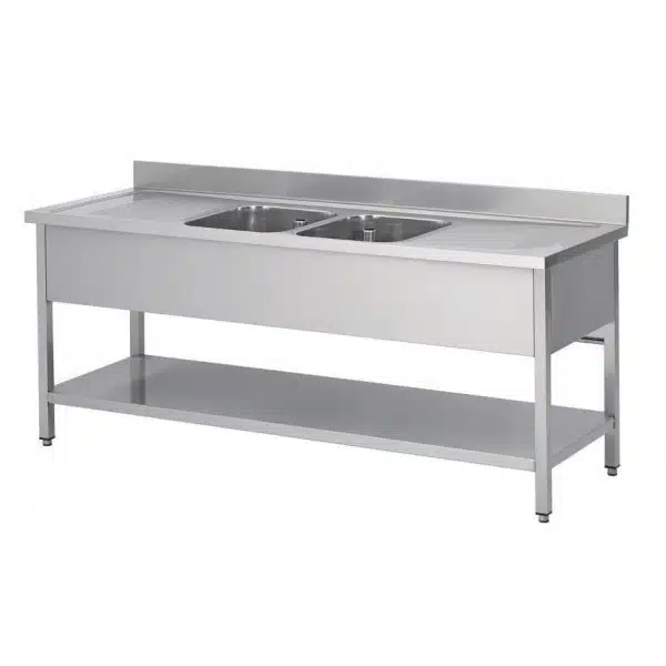 Plonge soudée sur pieds carrés avec étagère, inox AISI 304, indispensable pour assurer la propreté de vos vaisselles et de vos ustensiles de cuisine.