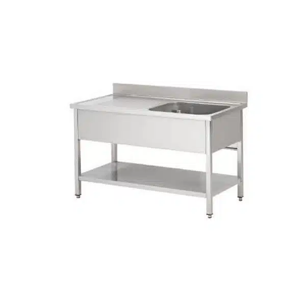 Plonge soudée sur pieds carrés avec étagère, inox ferritique,1 bac gauche, indispensable pour assurer la propreté de vos vaisselles et de vos ustensiles de cuisine.