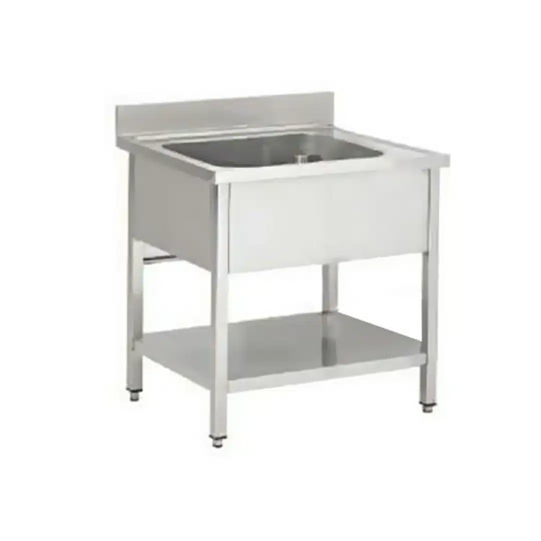 Plonge soudée sur pieds carrés sans étagère, indispensable pour assurer la propreté de vos vaisselles et de vos ustensiles de cuisine.