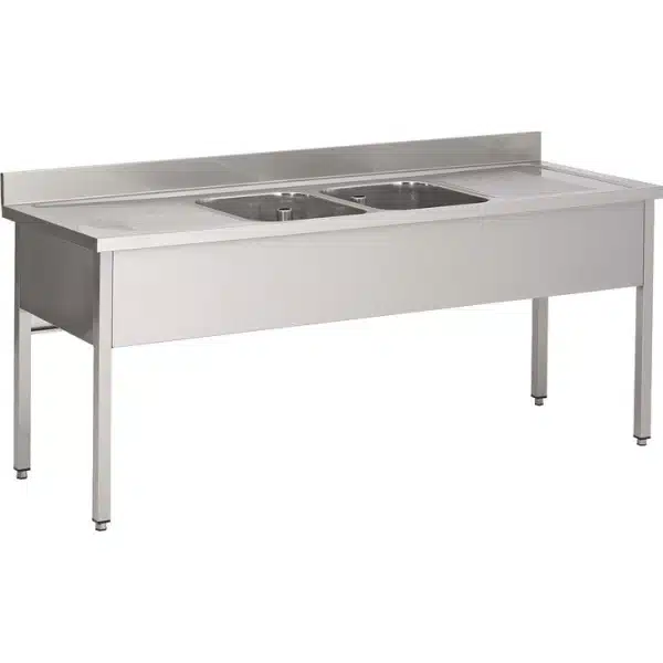 Plonge soudée sur pieds carrés sans étagère, inox AISI 304, 2 bacs au centre, longueur 2000 mm