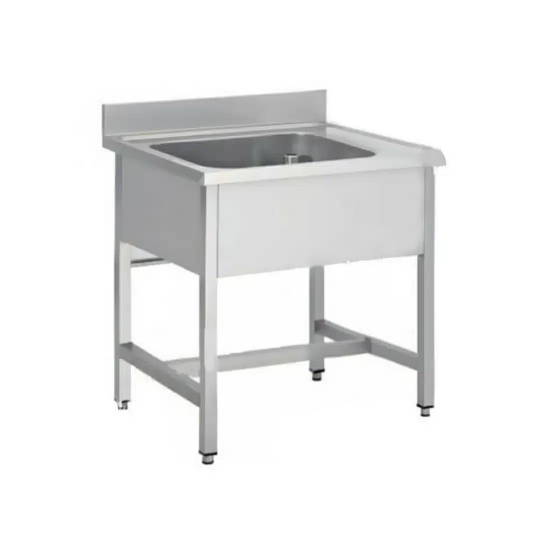 Plonge soudée sur pieds carrés sans étagère, indispensable pour assurer la propreté de vos vaisselles et de vos ustensiles de cuisine.