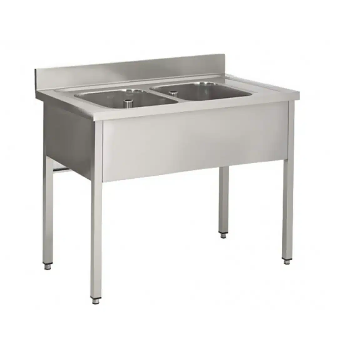 Plonge soudée sur pieds carrés sans étagère, inox ferritique, 2 bacs, indispensable pour assurer la propreté de vos vaisselles et de vos ustensiles de cuisine.