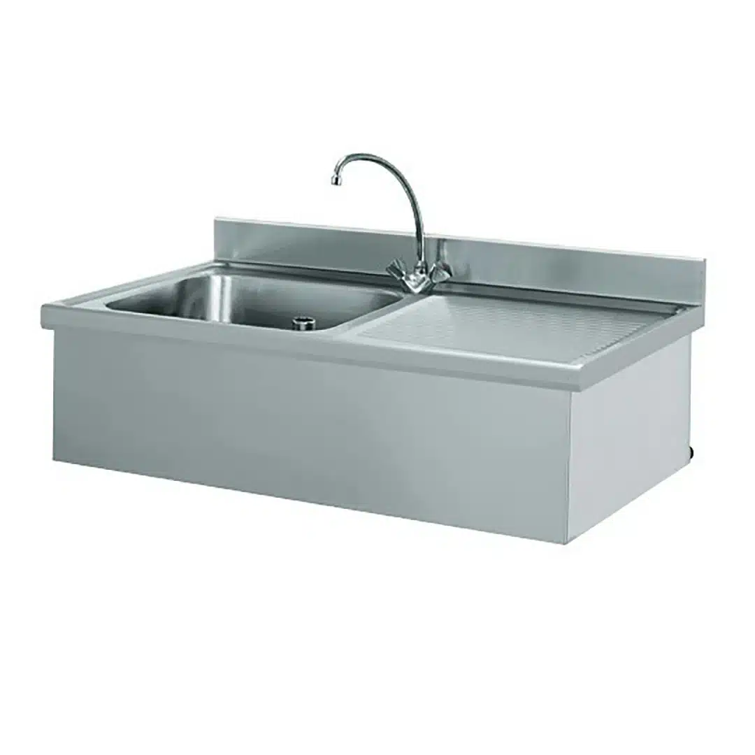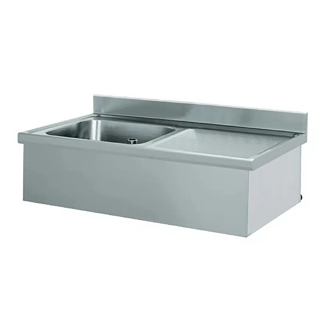 Plonge suspendue adossée, 1 bac à gauche, 1 égouttoir à droite, vous permet d’economiser de l’espace dans votre cuisine, tout en assurant la propreté de vos ustensiles de cuisine.