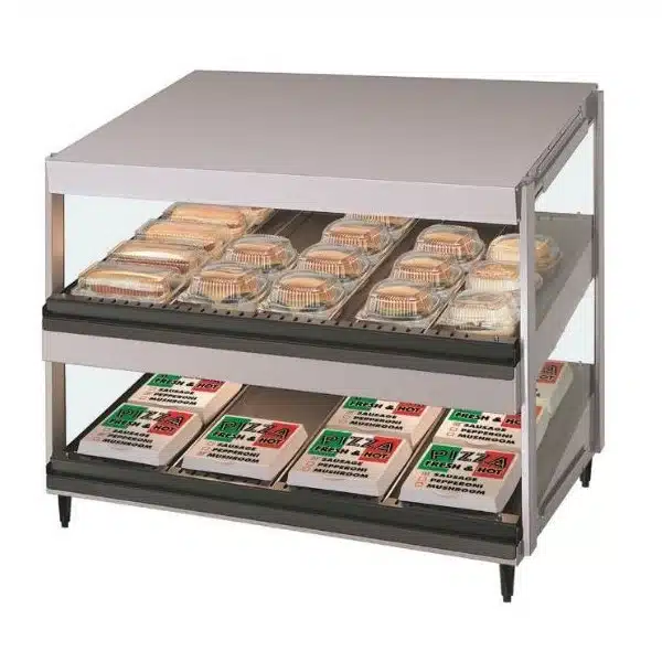 Présentoir chauffant,incliné double, spécialement conçu pour mettre en valeur les produits emballés ou en boîte