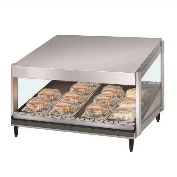 Présentoir chauffant,incliné simple,spécialement conçu pour assurer le maintien des produits emballés ou en boîte.