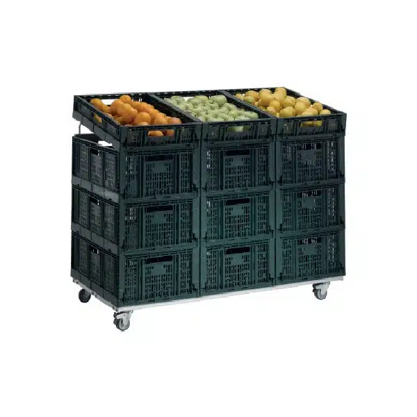 Présentoirs fruits et légumes, pour présentater un maximum de produit sur une surface, facilement manoeuvrable grâce aux 4 roulettes.
