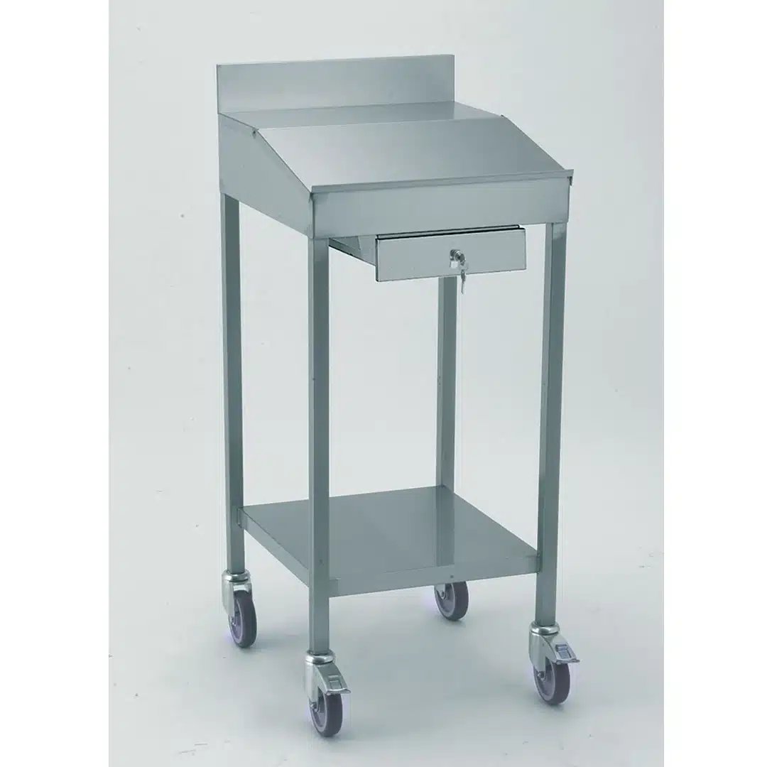 Pupitre sur roulettes, acier inoxydable, avec tiroir fermant à clé, dessus coffre avec couvercle rabattable formant plan de travail incliné.