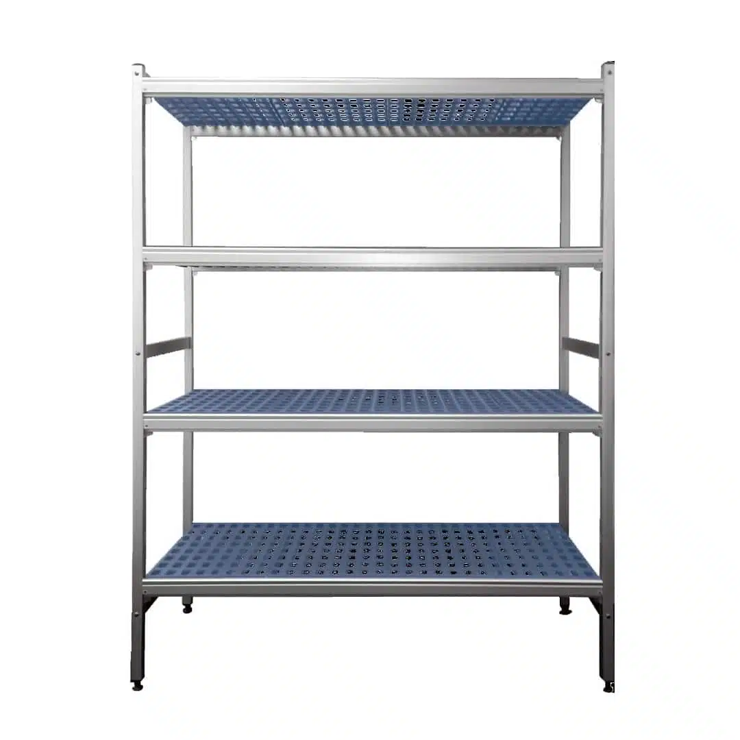 Rayonnage aluminium 4 niveaux H 1700 mm, clayettes polypropylènes lavables en machine pour une hygiène irréprochable, parfait pour le stockage des produits alimentaires.