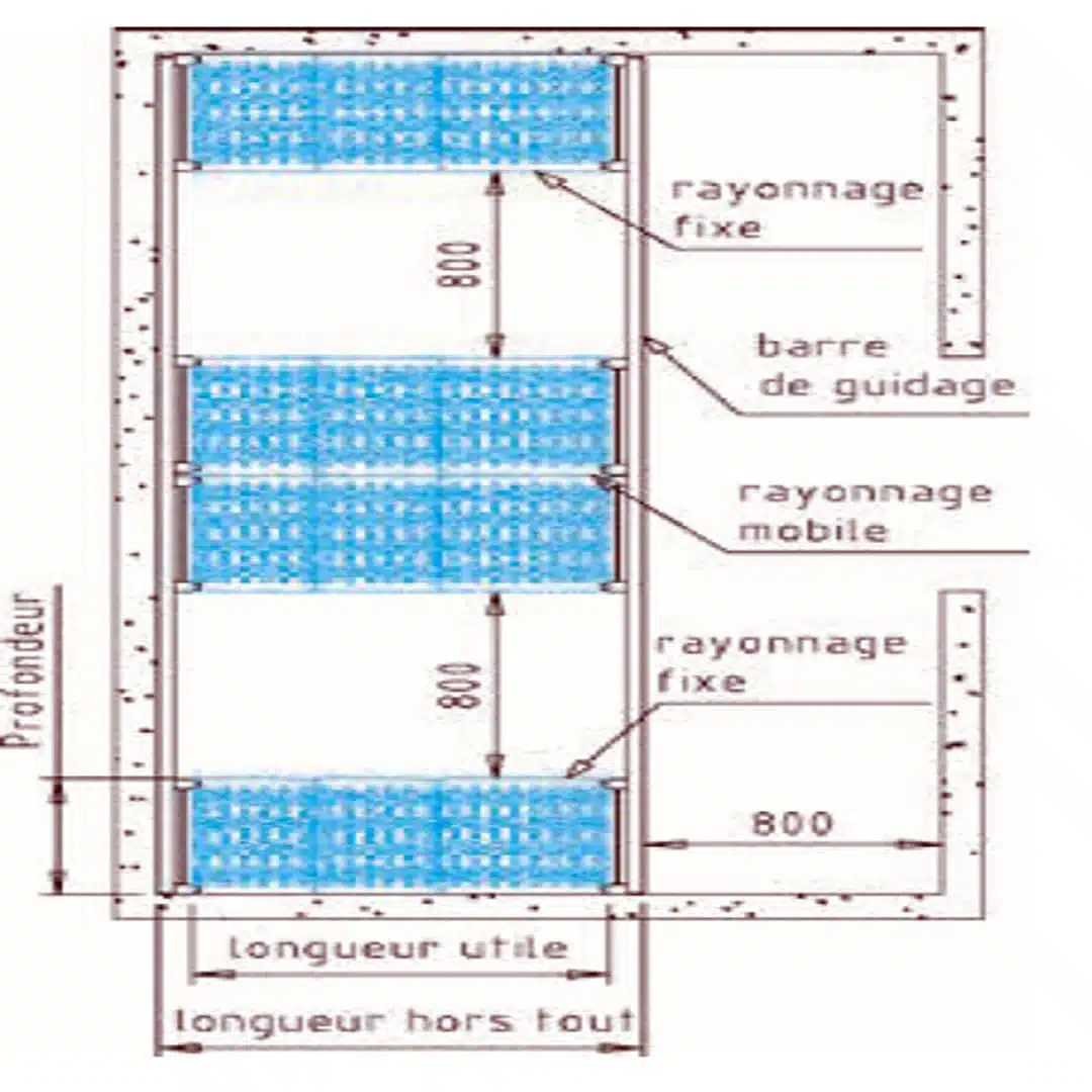 - Structure : Composée de deux rayonnages fixes aux extrémités, reliés par deux barres de guidage supérieures. Entre ces structures fixes, plusieurs rayonnages mobiles sur roues, orientés vers l’intérieur, peuvent être déplacés selon les besoins.