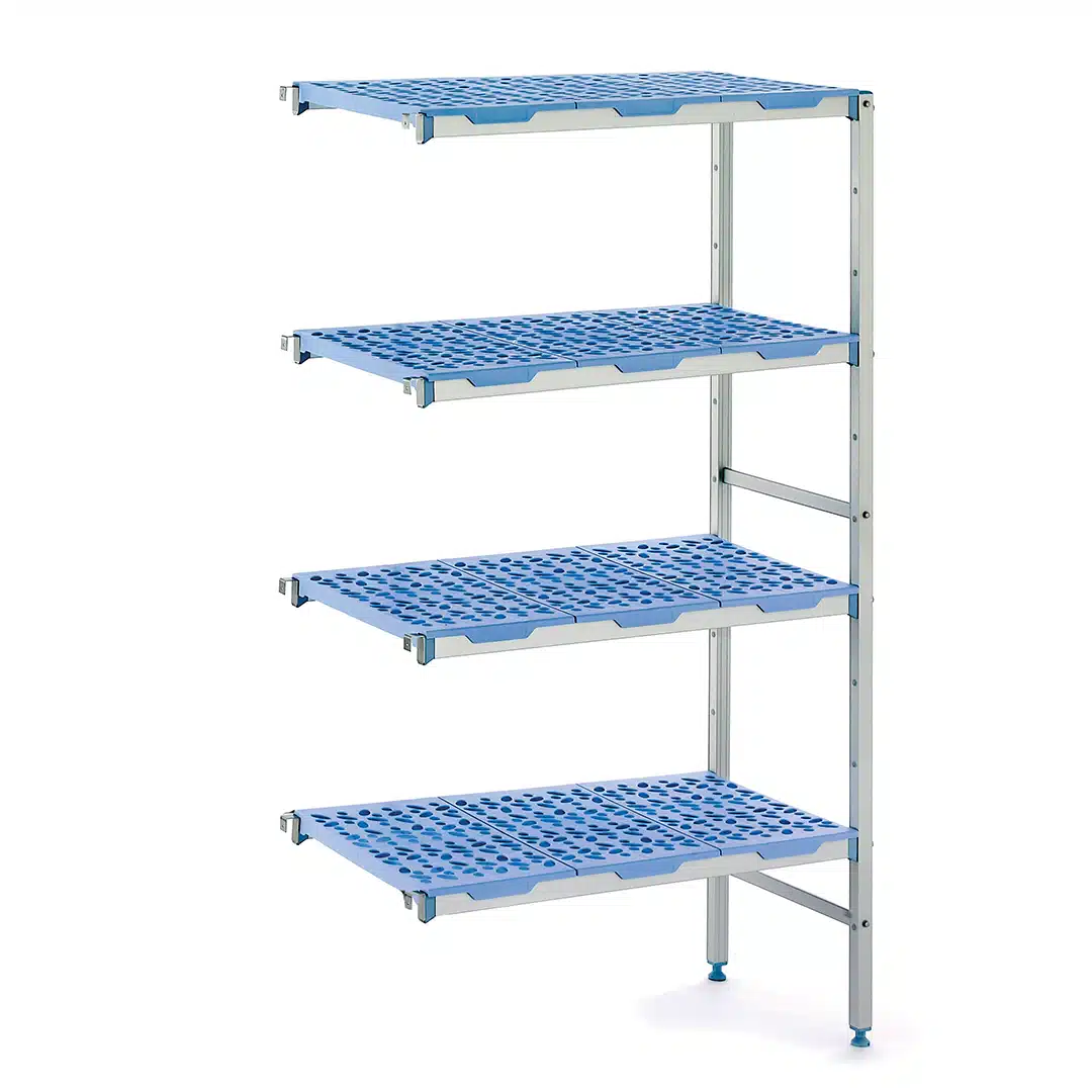 Rayonnage angle clayette polypropylène 5 niveaux P 560 mm, hauteur 1750 mm, hygiène impeccable avec ses clayettes amovibles et lavables en machine, idéal pour une utilisation en chambre froide.