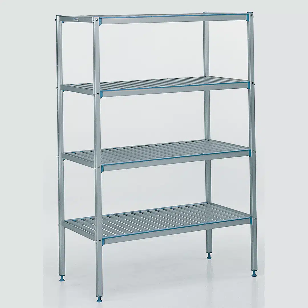 Rayonnage en ligne clayettes Alu anodisé 5 niveaux P 500 mm, hauteur 2050 mm, très pratique pour le stockage de produit de grande quantité en chambre froide.