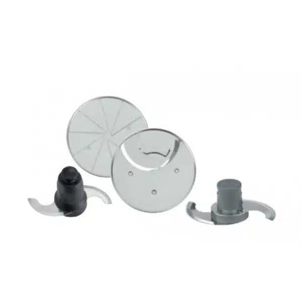 Livré avec un couteau en S dentelé, un disque à trancher de 2 mm et un disque à râper de 4 mm