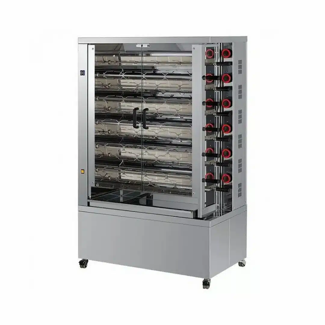 Rôtissoire à broche gaz double ligne 11 DOBLE EKO, 11 broches, idéale pour les grands établissements de restauration, permet de cuire simultanément jusqu’à 66 poulets.