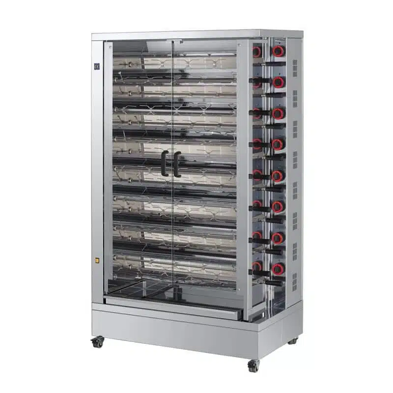 - Grande Capacité : Capable de rôtir jusqu’à 90 poulets simultanément, adaptée aux grandes cuisines professionnelles.