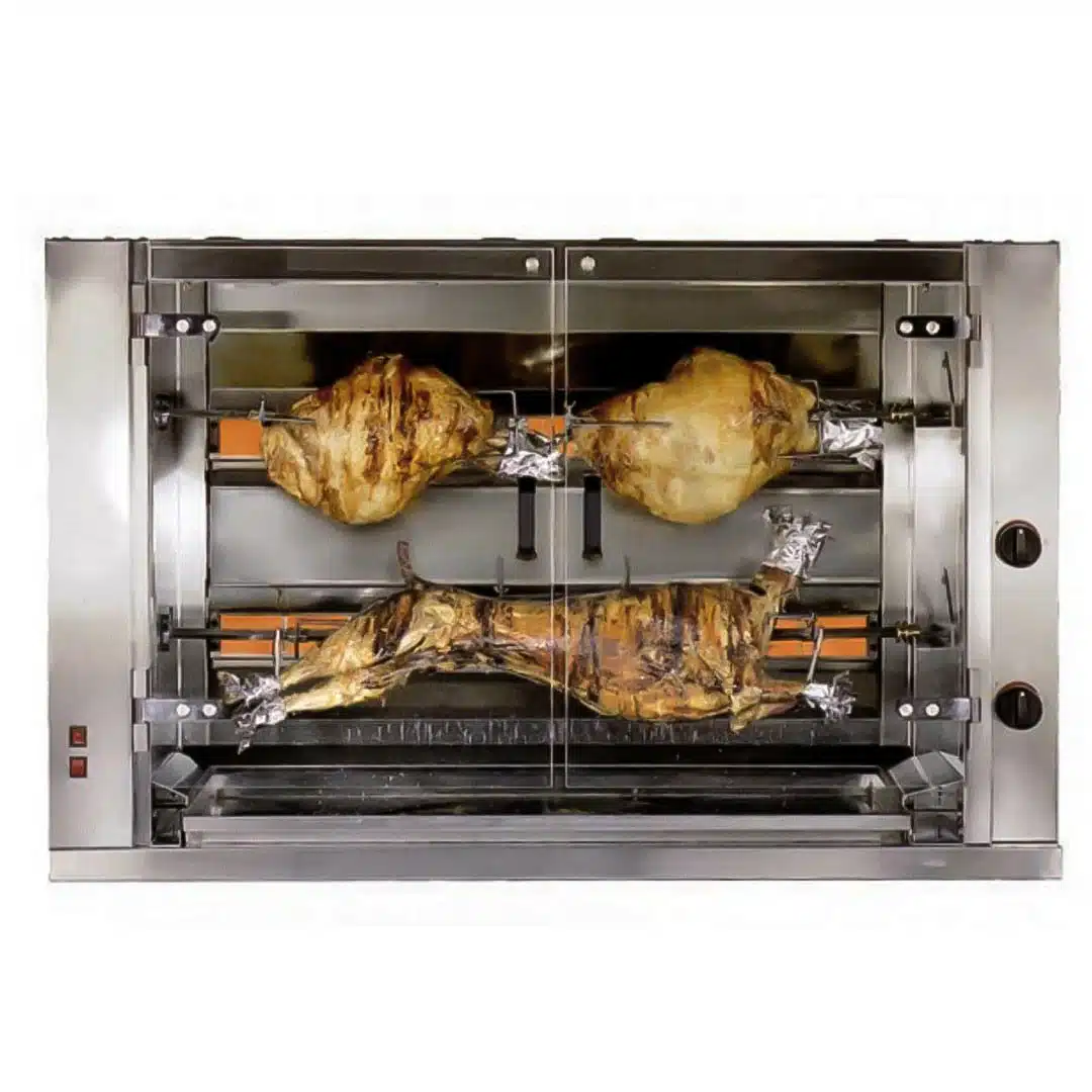 Barbecue mechoui professionnel, conçue pour rôtir simultanément deux viandes ou volailles, offrant une cuisson savoureuse et uniforme. Son design compact et sa facilité d’utilisation en font un choix idéal pour les professionnels de la restauration et les amateurs de cuisine.