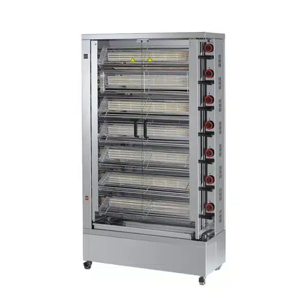 Découvrez notre rôtissoire de dernière génération, modèle 735 EKO, équipée de 7 grilles et d’un brûleur à gaz haute performance. Conçue spécialement pour les poulets ouverts, cette rôtissoire est idéale pour les professionnels cherchant à maximiser l’efficacité et la qualité de cuisson.