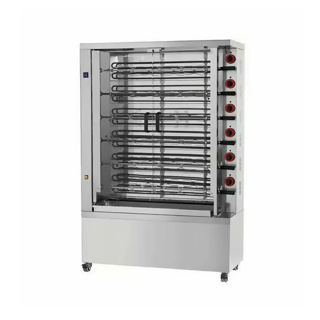 Découvrez notre rôtissoire de dernière génération, modèle 630 EKO-E, équipée de 6 broches et d’un système électrique simple. Idéale pour cuire entre 30 et 36 poulets, selon leur poids et leur disposition. Parfaite pour les professionnels cherchant à maximiser l’efficacité et la qualité de cuisson.