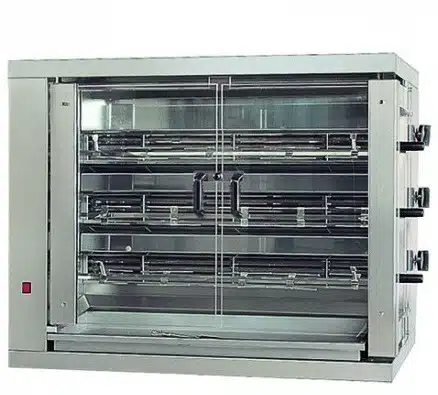Rôtissoire électrique en inox, conçue pour la cuisson de volailles et garantit une cuisson rapide.