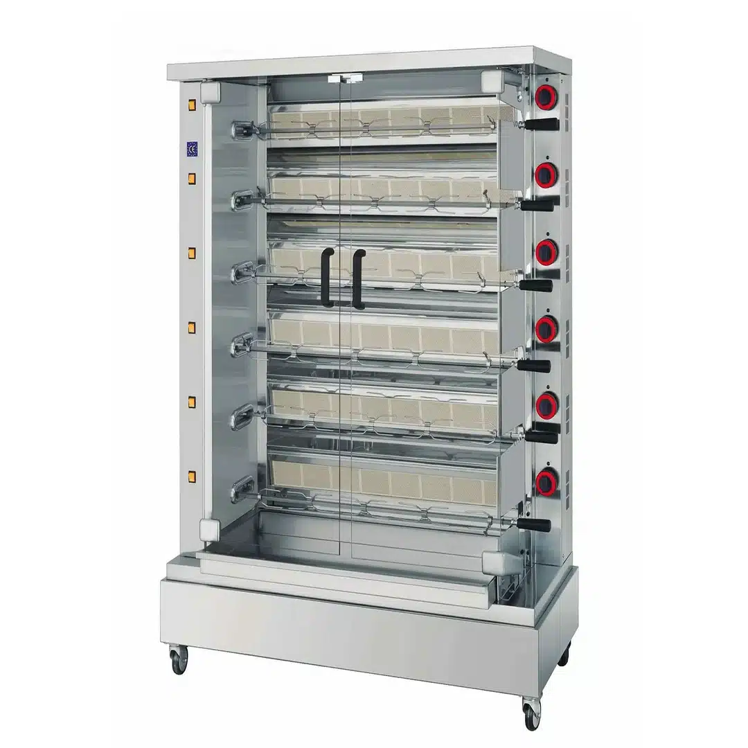 Rôtissoire Industrielle à gaz INDES 6, doté de 6 broches, idéal pour une cuisson uniforme et rapide de 36 poulets. Parfait pour les professionnels de la restauration, ce modèle intègre un moteur individuel par brûleur pour une performance ininterrompue.