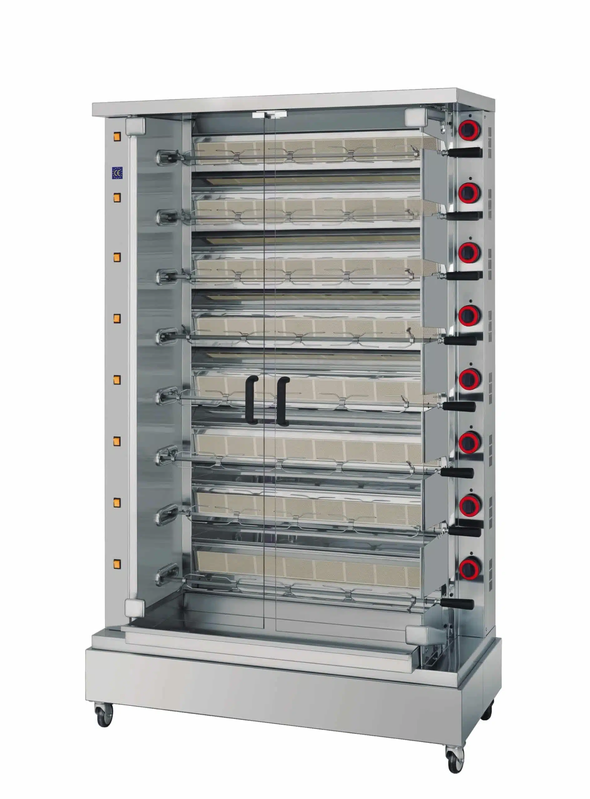 Rôtissoire industrielle à rayons infrarouges modèle DESIN 8 avec brûleur à gaz, équipé de 8 broches, pouvant cuire jusqu’à 48 poulets. Chaque broche dispose d’un moteur individuel, assurant un fonctionnement continu et une cuisson homogène.