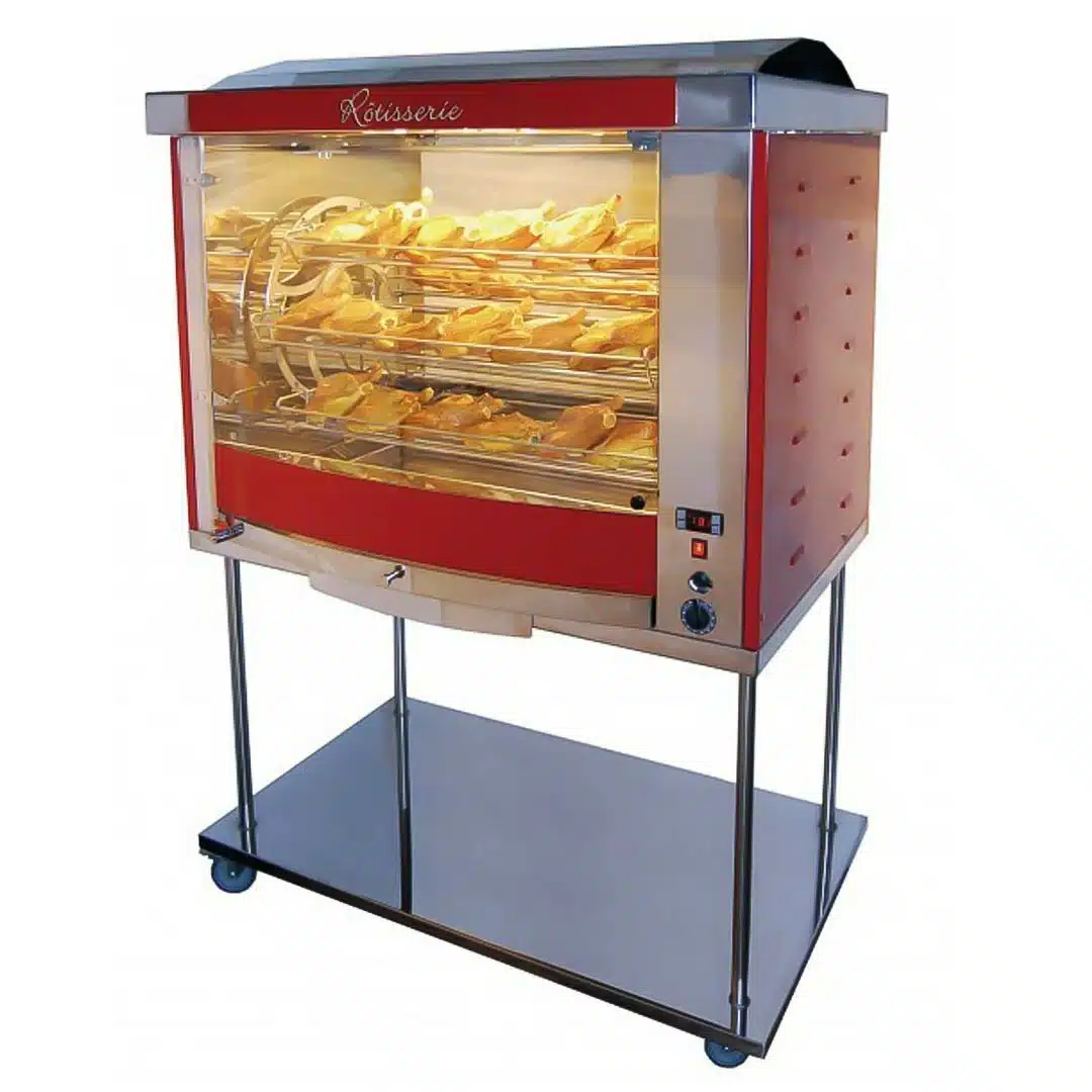 Rôtissoire à Balancèlle modèle FUSION7C, sur châssis inox à roulettes allie mobilité et performance. Conçue en acier inoxydable, elle garantit une cuisson uniforme et savoureuse des viandes et volailles.