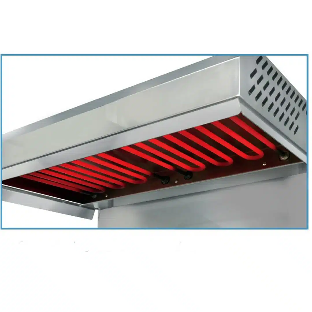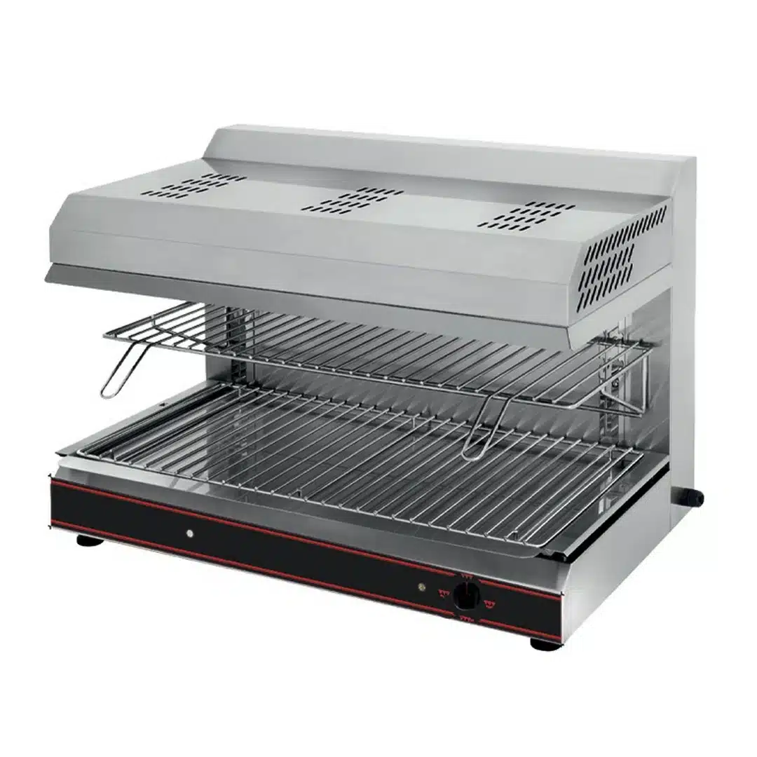 Salamandre électrique équipée de deux résistances blindées en Incoloy, parfaite pour cuire, gratiner et réchauffer vos plats avec efficacité.