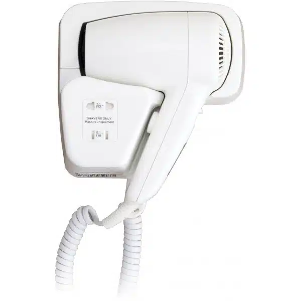 Ce sèche-cheveux avec prise rasoir est très pratique pour bien équiper vos salles de bains, surtout pour les salles de bain de chambres d’hôtel ou dans un vestiaire, discret et fonctionnels.
