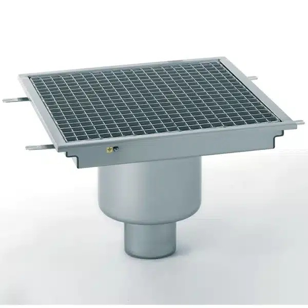 Évacuation du caniveau équipée d’un croisillon qui permet d’arrêter les déchets, garantissant une propreté optimale et un entretien simplifié.