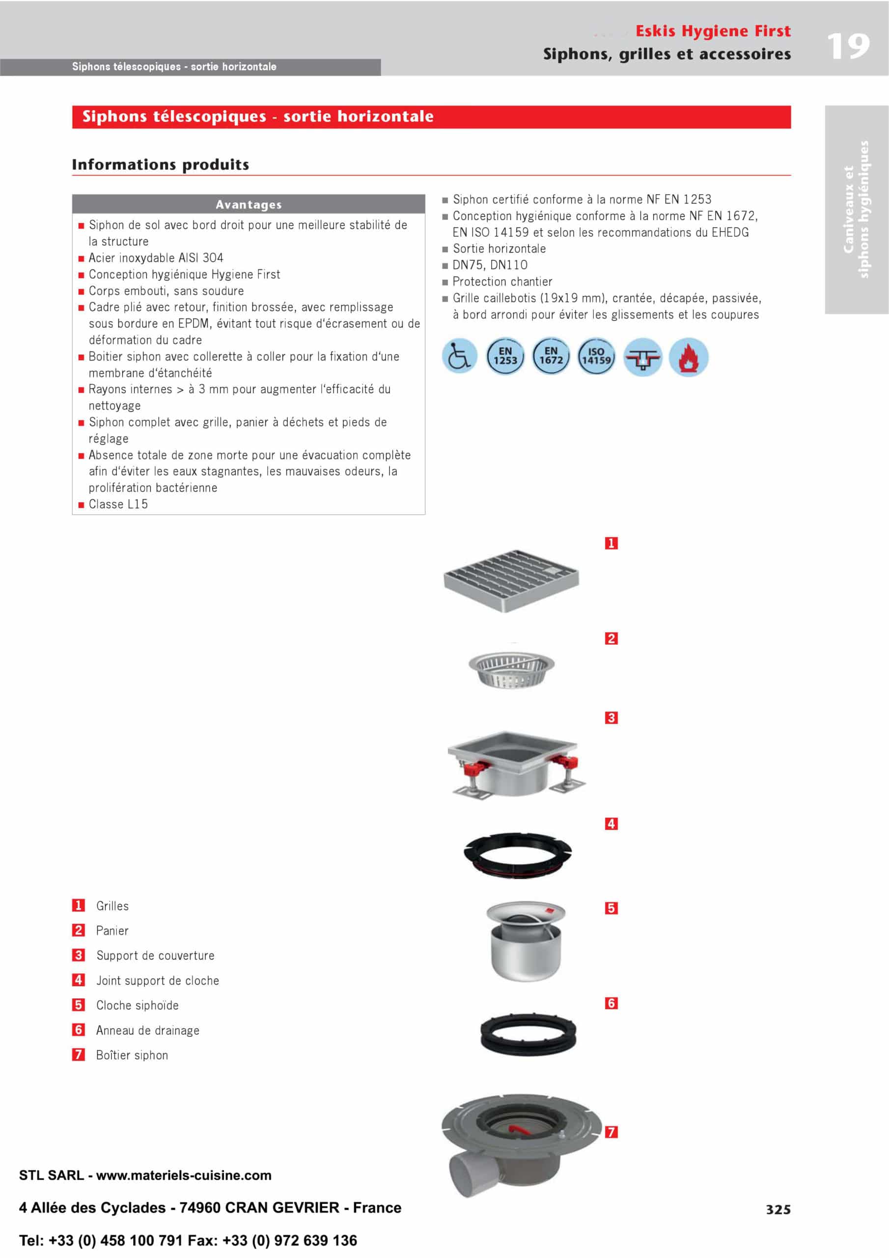 Siphon Eskis hygièneFirst avec grilles inox 200 x 200 mm sortie horizontale Ø 75 mm
