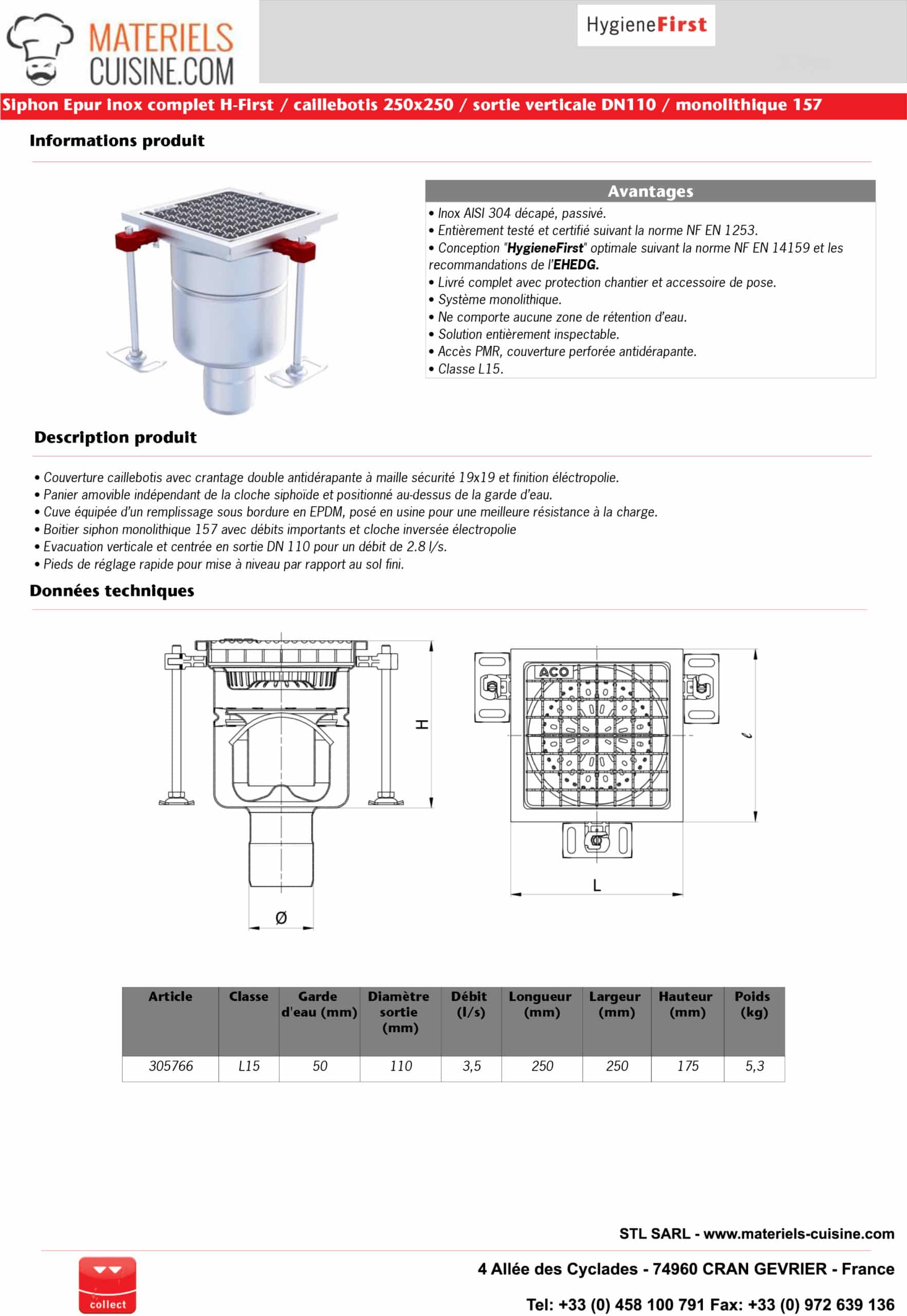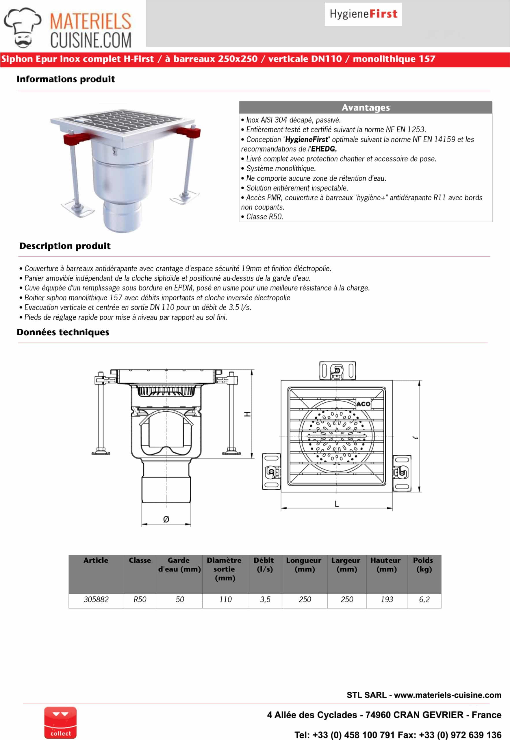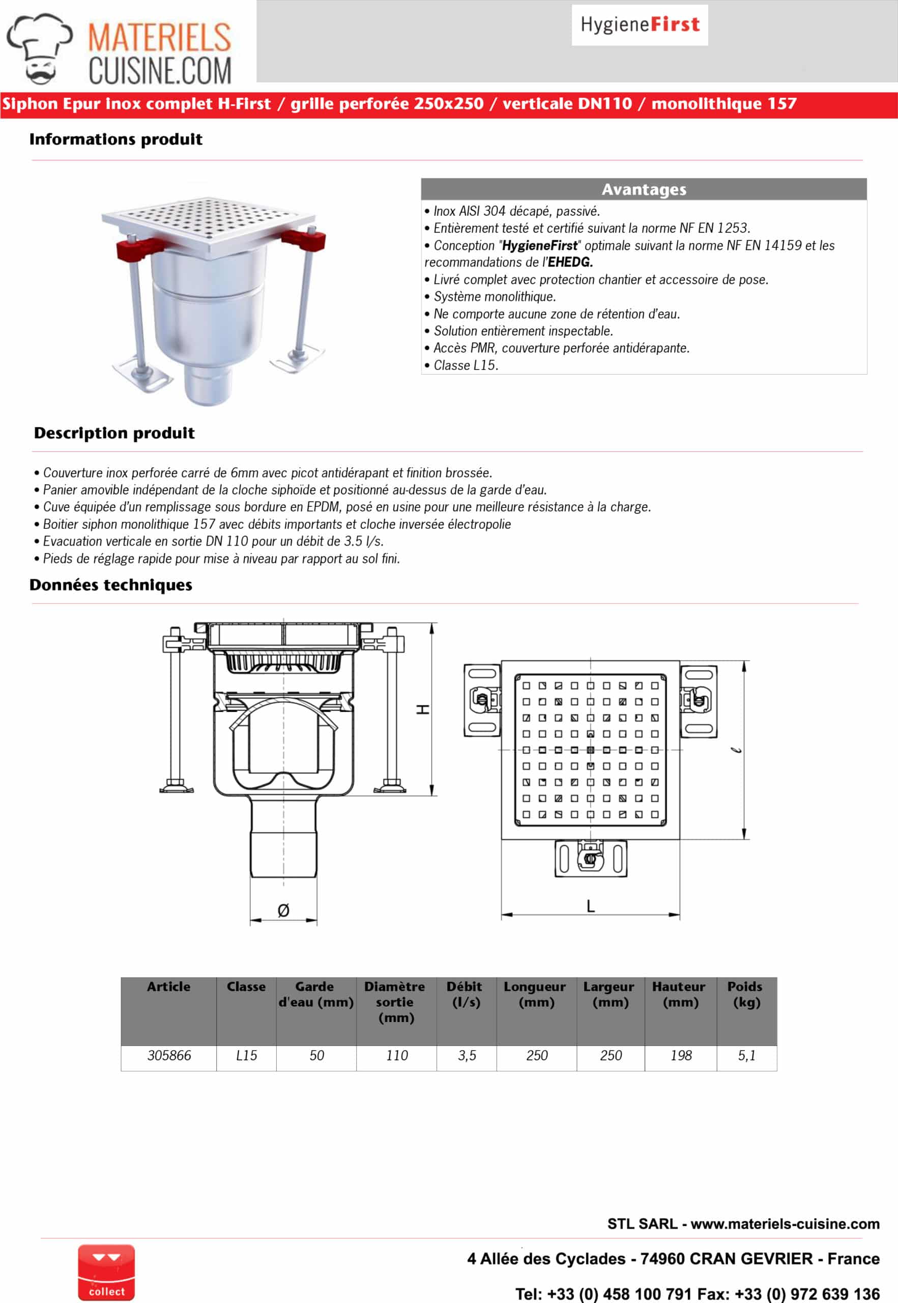Siphon monolithique Epur HygieneFirst avec grilles inox 250 x 250 mm sortie verticale Ø 157 mm