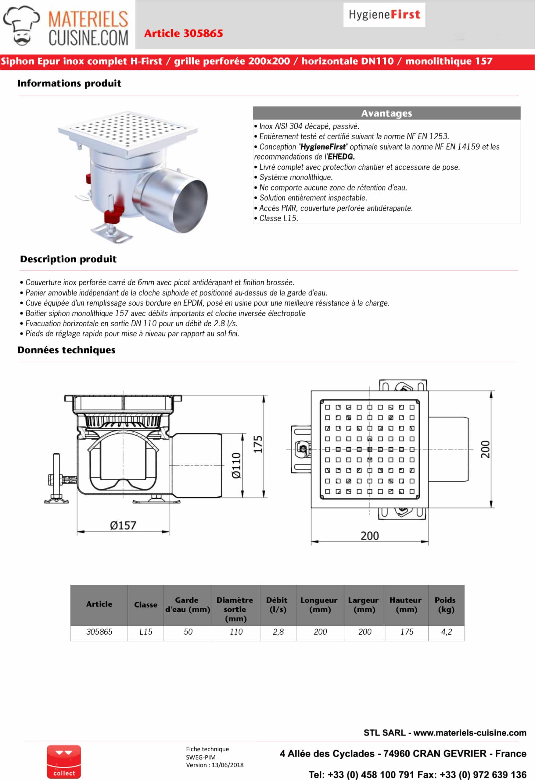 Siphon monolithique Epur HygieneFirst avec grille inox perforée 200 x 200 mm sortie horizontale Ø 157 mm 2,8 L/s