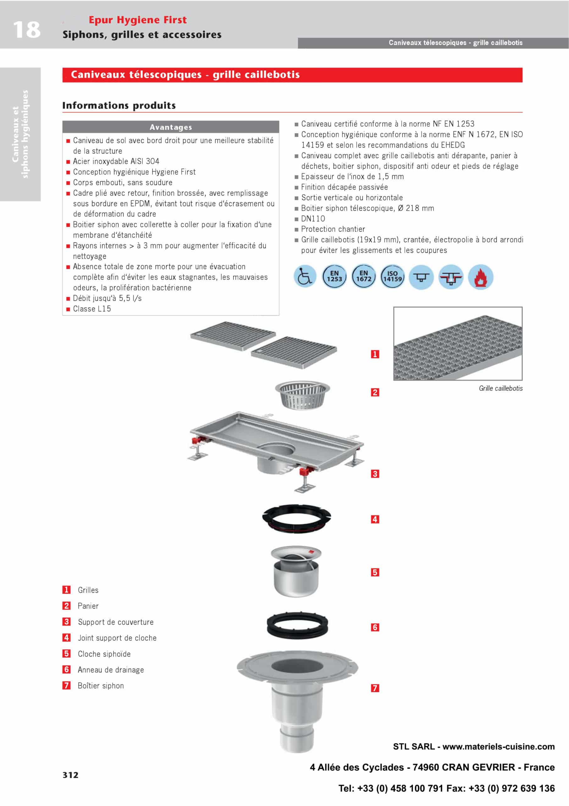 Caniveau téléscopique Epur HygieneFirst avec grilles caillebotis 500 x 500 mm sortie verticale centrée Ø 110 mm
