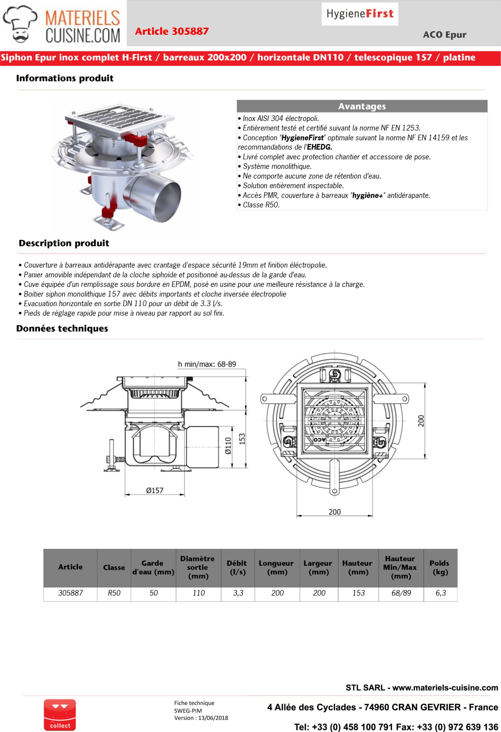 - Certification : Entièrement testé et certifié suivant la norme NF EN 1253.
