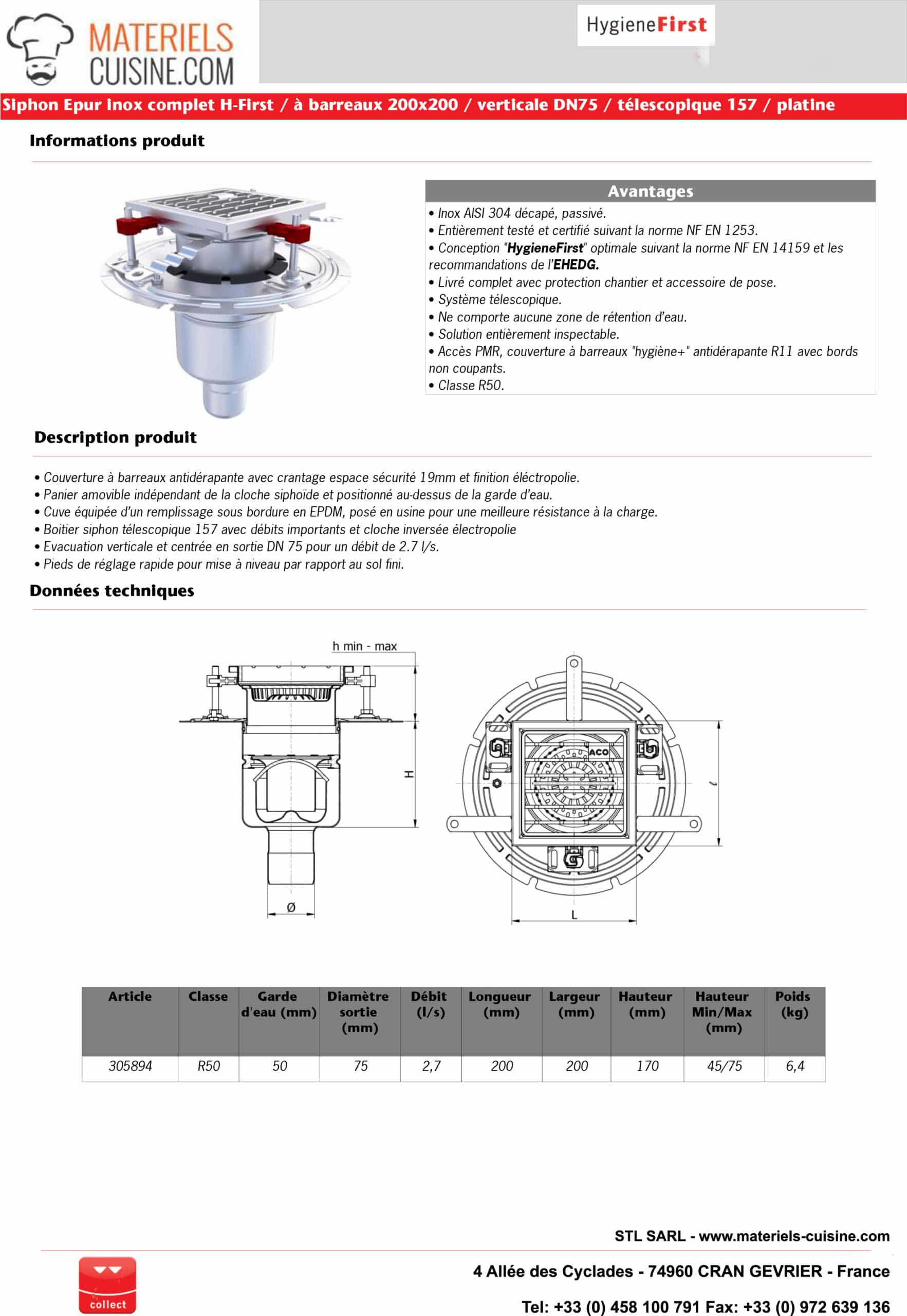 Siphon téléscopique Epur HygieneFirst avec grilles inox à barreaux 200 x 200 mm sortie verticale Ø 157 mm 2.7 L/s
