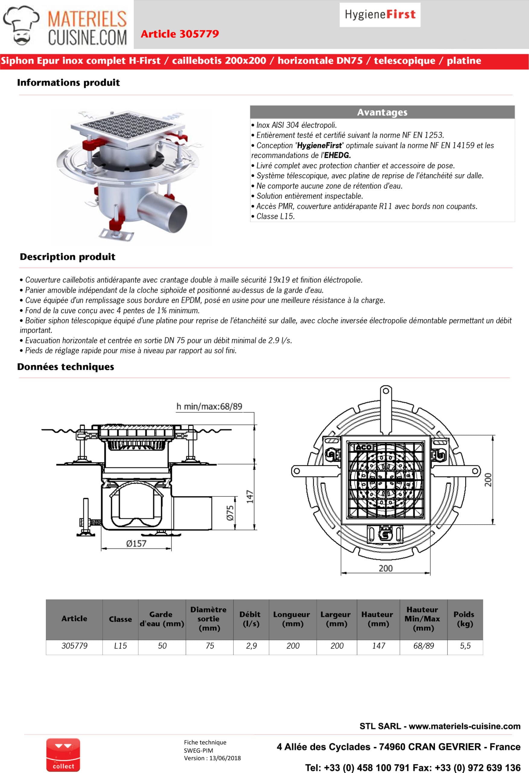 - Boîtier Siphon : Télescopique équipé d’une platine pour reprise de l’étanchéité sur dalle, avec cloche inversée électropolie démontable permettant un débit important.