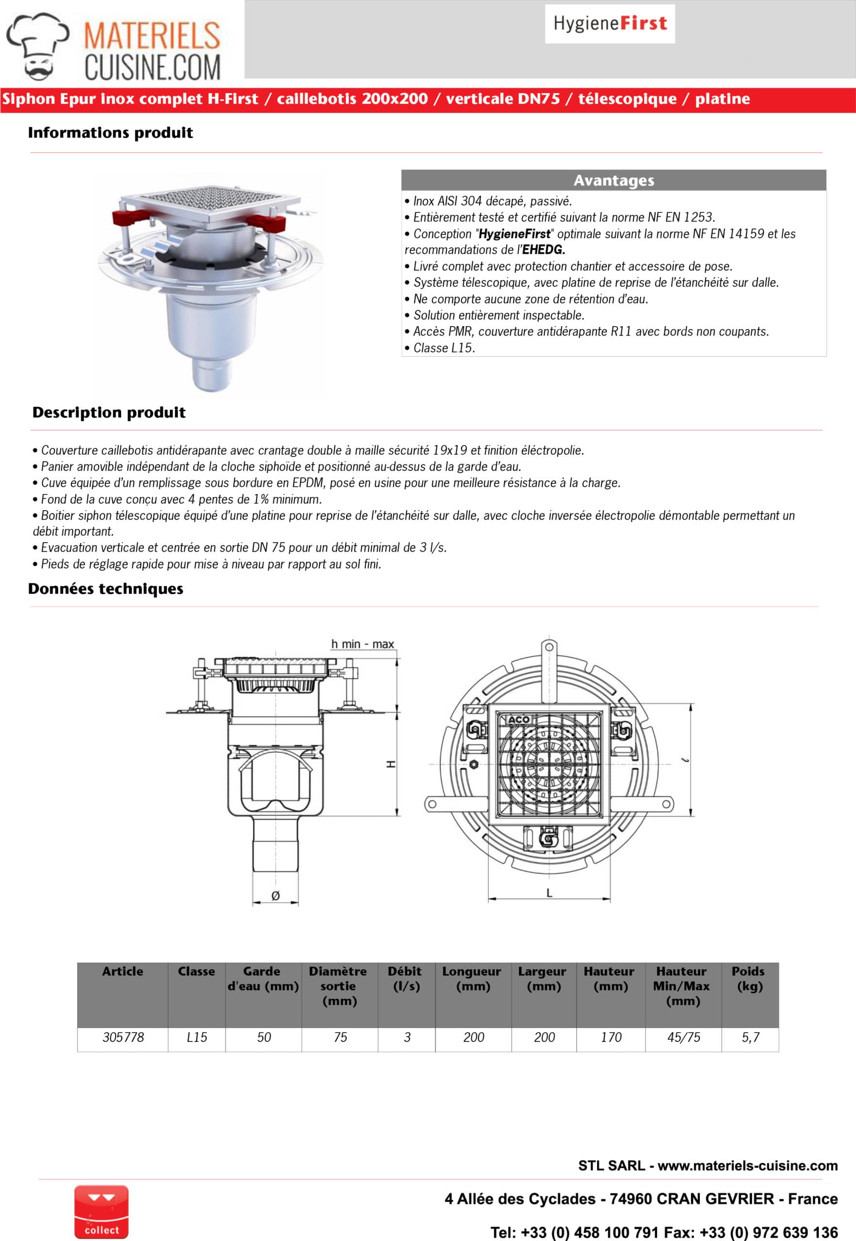 Siphon inox téléscopique 200 x 200 mm avec grilles caillebotis antidérapante, un matériel de qualité pour équiper vos cuisines professionnelles.