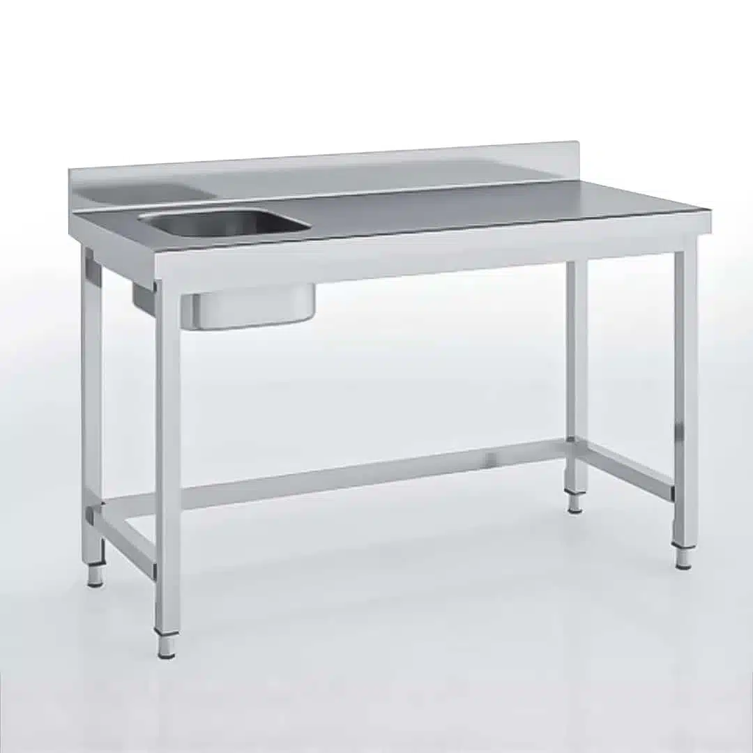 Table de chef, série 600, inox AISI-304 18/10 satiné, bac à gauche, avec renfort