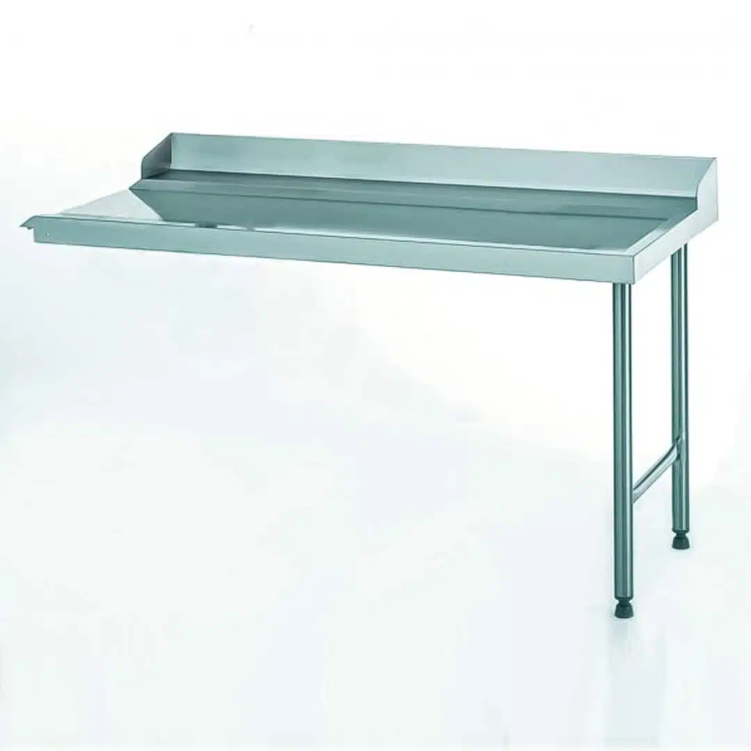 Table de glissement avec plage arrière et dosseret sur mesure, raccordable sur une machine ou sur une autre table, avec une structure robuste en acier inoxydable, idéale pour les professionels de la restauration.