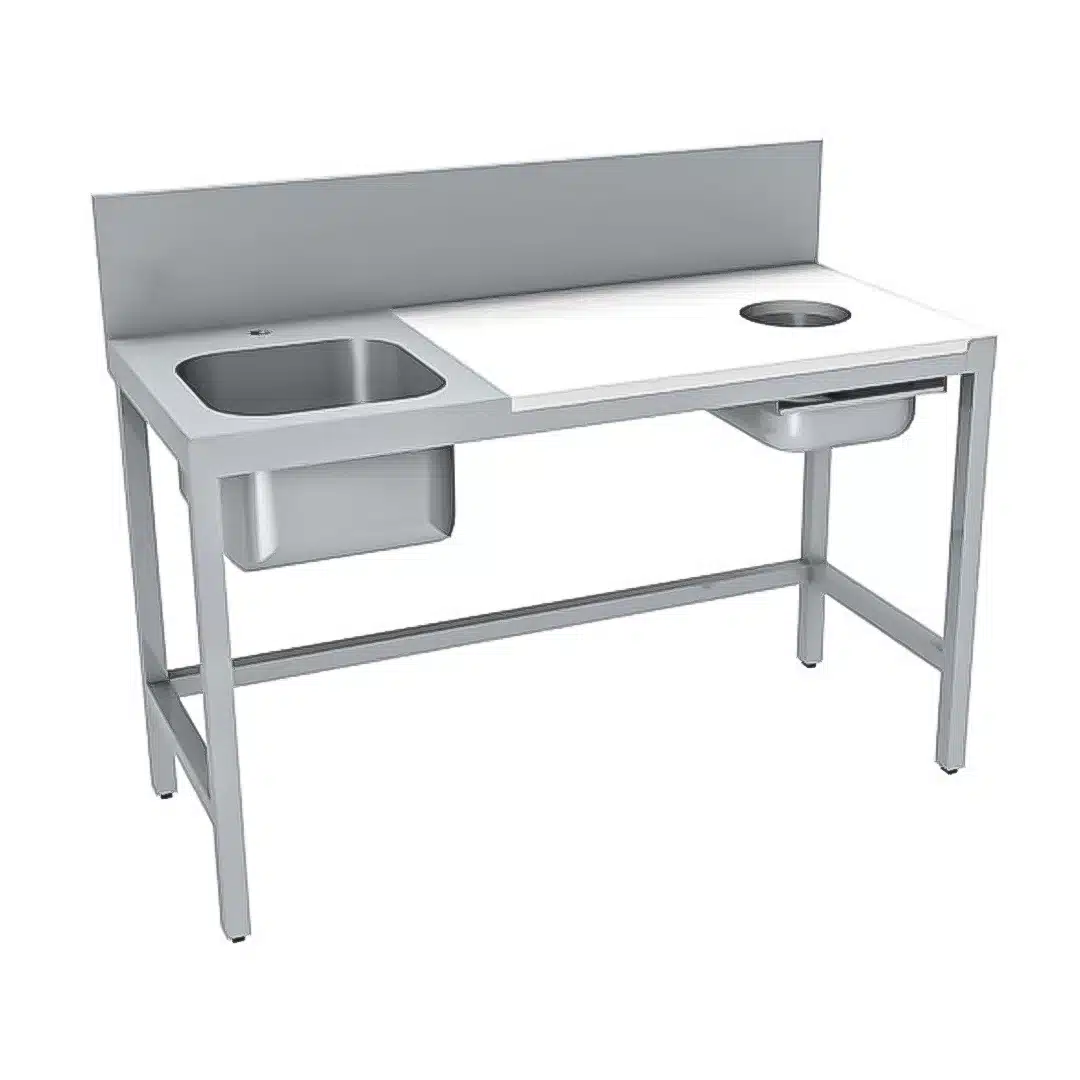 Table de préparation, 1 bac de rinçage avec tiroir GN1/1, dessus mixte inox, poly à droite, permet un confort de préparation, idéale pour avoir la meilleure organisation et rapidité de préparation.